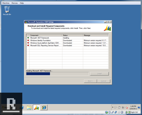 On the Download and Install Required Components, click Install. It will prompt to download components, click Yes. Pre-warning: I had this step freeze up (no installation bar and all the arrows stay red) if this happens, wait 30 minutes, kill the task, and restart from the top of this post. Once done, click Next.