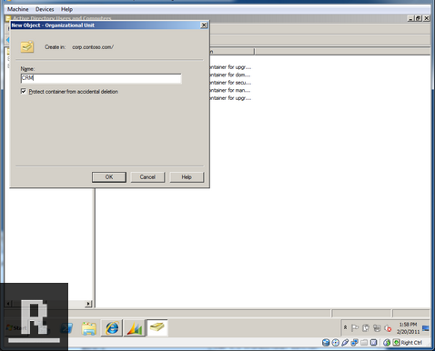 Right click corp.contoso.com -> New -> Organizational Unit, call it CRM, click OK, a new OU called CRM should now exist. Now you can close the Active Directory Users and Computers window.