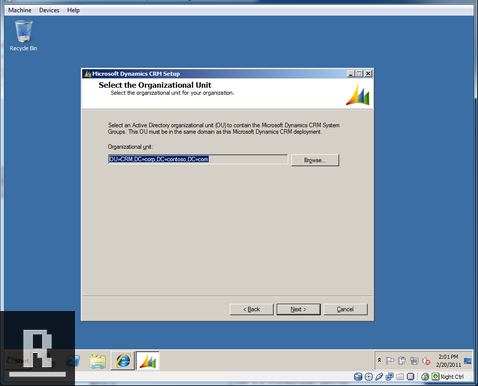 Select the Organizational Unit. We need to create an OU for CRM before we can proceed with this step.