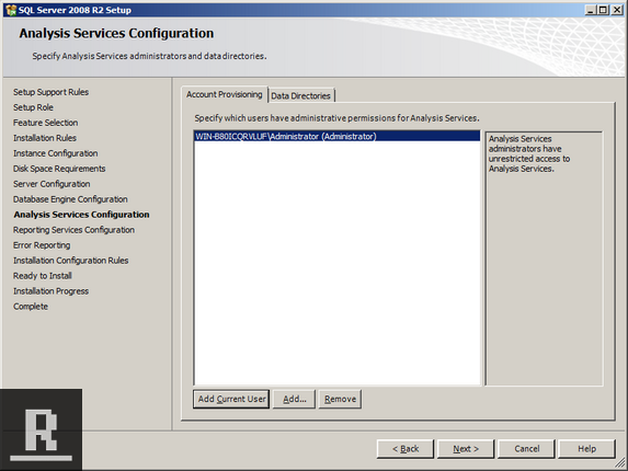 For Setting up the Analysis Service Account Provisioning, click “Add Current User” (which will add the administrator account you’re logged in as). Click Next