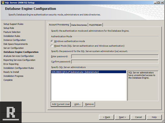 For Setting up the Database Engine Account Provisioning, click “Add Current User” (which will add the administrator account you’re logged in as). Click Next