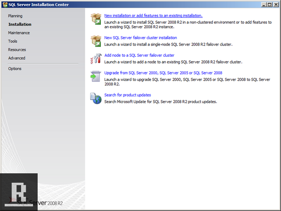 SQL Server Installation Center should come up. Click Installation, and then New Installation or add features to an existing installation.